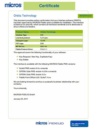 歐比特門鎖軟件接口獲得MICRO FIDELIO (OPERA)認證