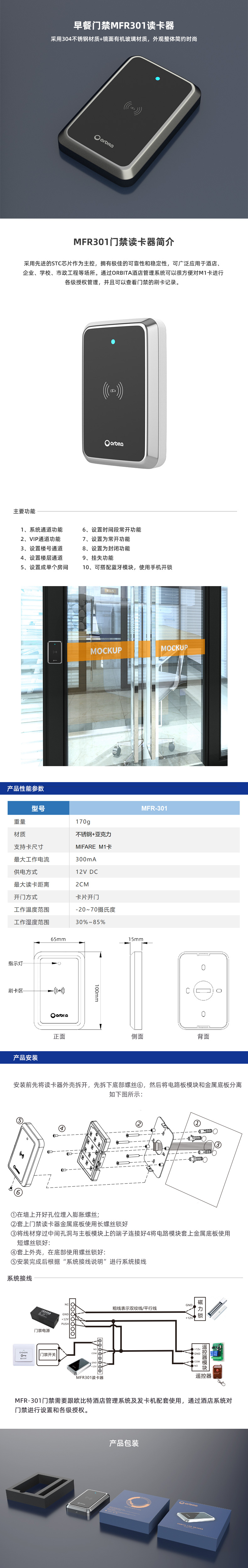MFR-301門禁采用先進的STC芯片作為主控,擁有極佳的可靠性和穩(wěn)定性,可廣泛應用于酒店、企業(yè)、學校、市政工程等場所。通過ORBITA酒店管理系統(tǒng)可以很方便對M1卡進行各級授權(quán)管理,并且可以查看門禁的刷卡記錄。